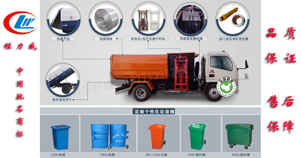 掛桶垃圾車的特點是一個車能配幾十個垃圾桶,能實現一臺車與多個垃圾桶聯合作業,循環運輸,充分提高了車輛的運輸能力,特別適用于短途運輸,如環衛部門對城鎮垃圾的清理、運輸等。同時,掛桶垃圾車還可以加裝其它功能,形成其它多功能掛桶垃圾車,如:掛桶壓縮式垃圾車、掛桶式泔水垃圾車、掛桶式對接垃圾車等。