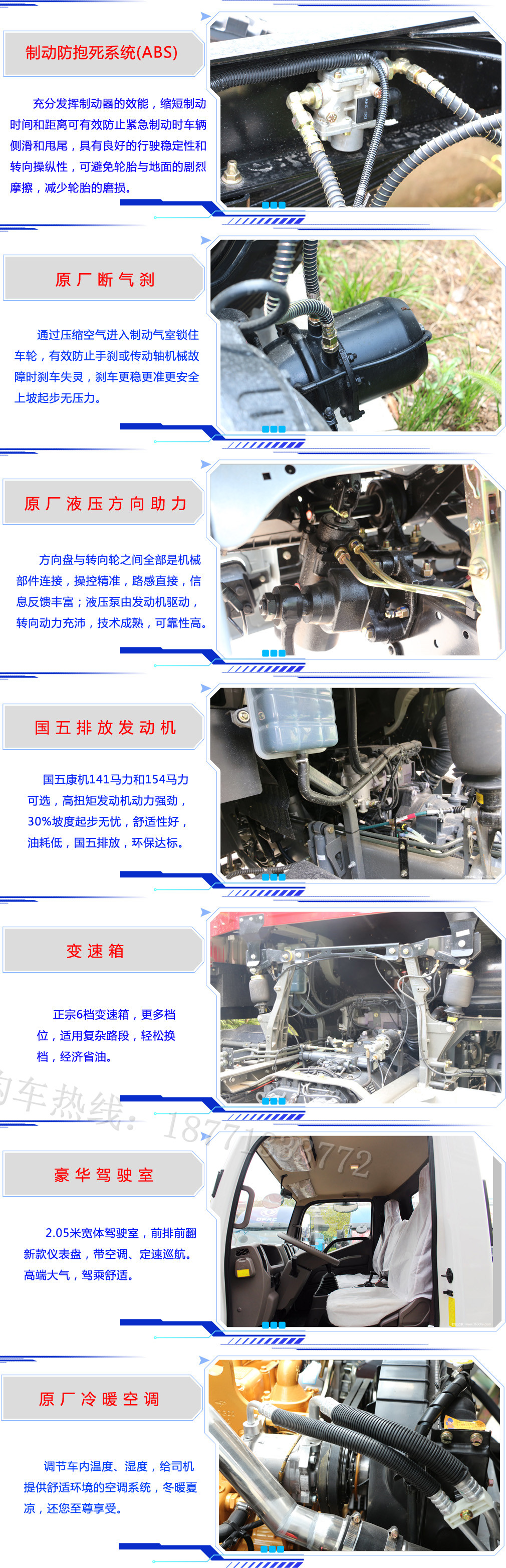 貨廂頂部封閉,不可開啟,選裝導流罩,選裝單、無側開門.選裝同等功率制冷機組,外觀形狀可不同.選裝液壓尾板,收起狀態的水平長度300mm.ABS廠家:威伯科汽車控制系統(中國)有限公司,ABS型號:44600XXXX0.側防護與貨箱橫梁的連接方式是螺栓連接,側防護材料為冷板B-2.0;后防護與車架縱梁的連接方式是螺栓連接,后下部防護裝置材料為冷板B-2.0矩形.后部防護裝置截面尺寸100mm×50mm,后防護離地高480mm.ISF3.8E6154發動機對應油耗值:21.3L/100km. |