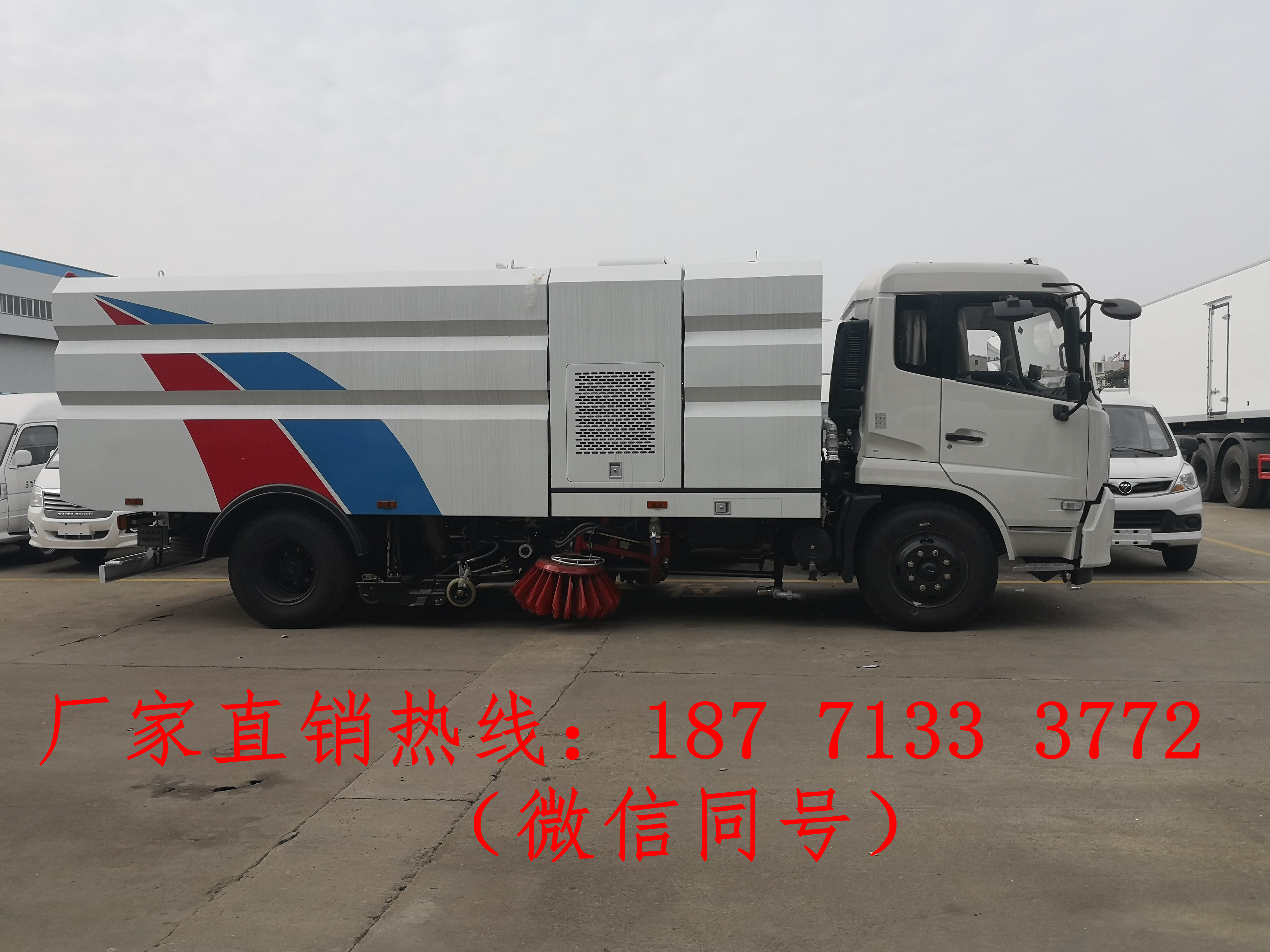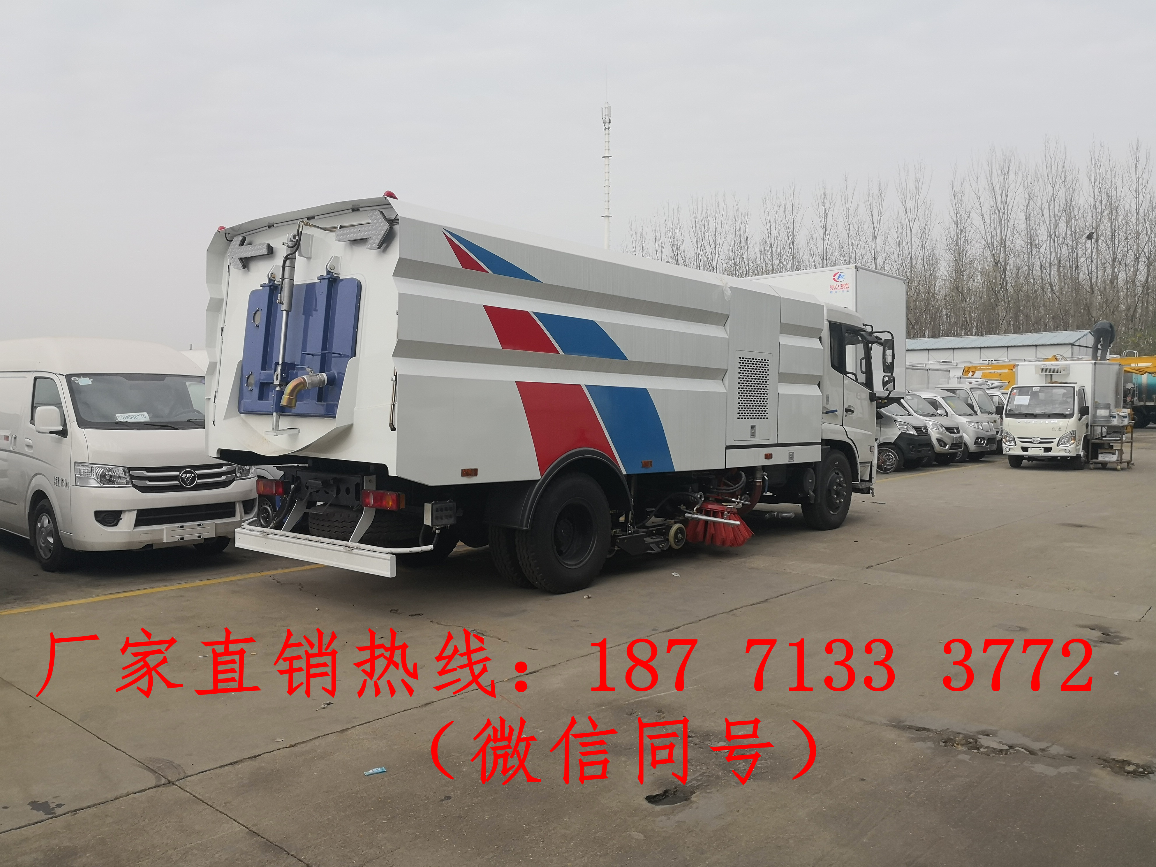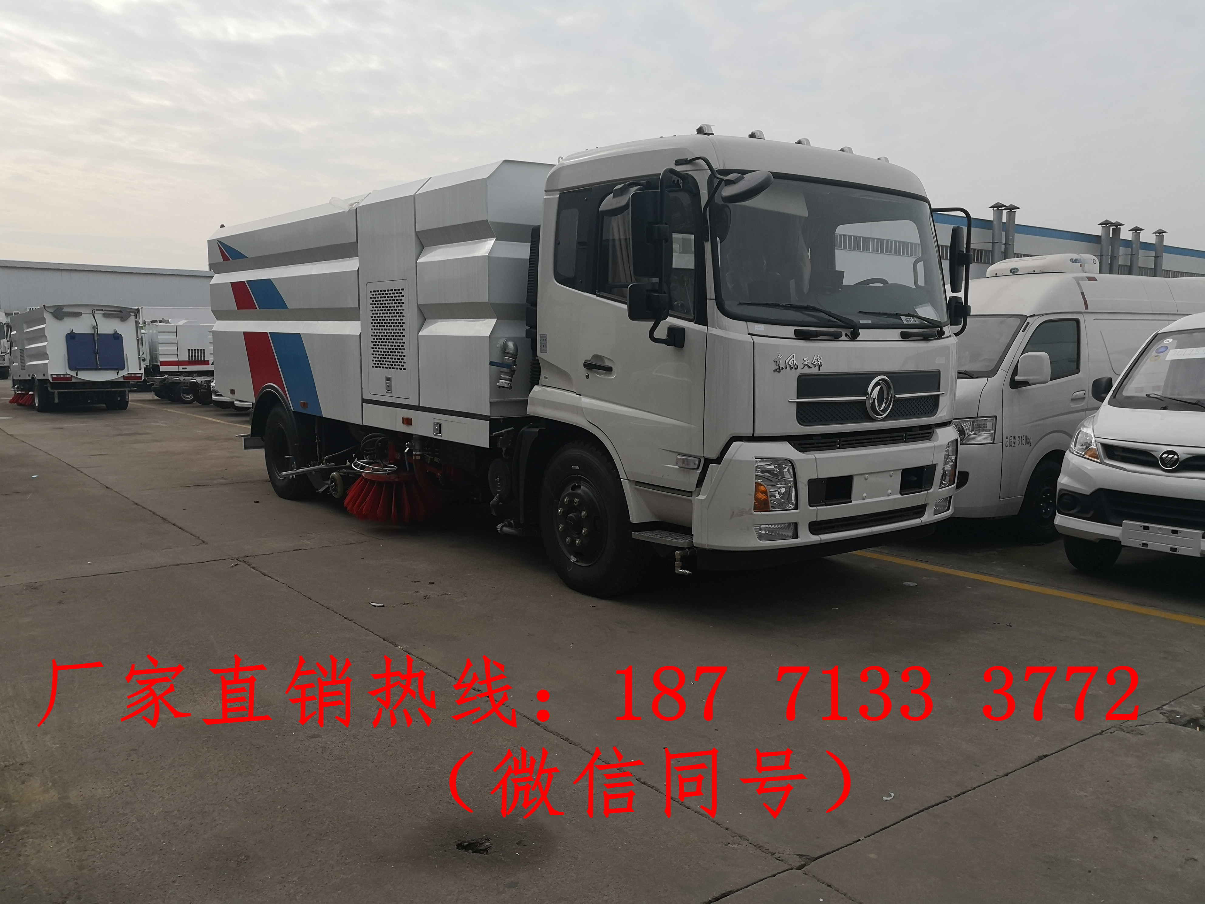 Ø 洗掃車采用東風天錦DFL1160BX1V型國Ⅳ二類汽車底盤改裝,加裝副發動機、風機、高壓水泵、清水箱、垃圾箱、左右立掃、帶噴水桿的寬吸嘴、低壓沖洗系統、掃盤降塵系統、液壓系統、專用裝置電控系統和副車架等改裝而成。
